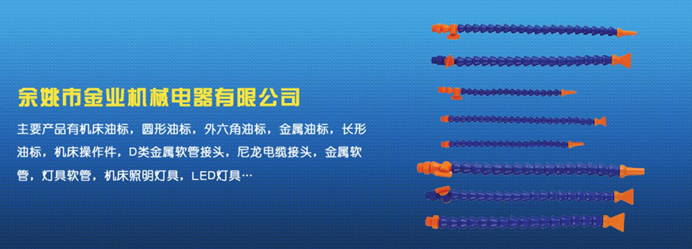 余姚市金業機械電器有限公司主要產品有機床油杯,圓形油標,外六角油標,金屬油標,長形油標,機床操作件,D類金屬軟管接頭,尼龍電纜接頭,金屬軟管,燈具軟管,機床照明燈具,LED燈具,DGT型線路軟管防護套,TL型鋼制電纜手軌,電纜尼龍拖鏈,可調塑鋼冷卻管等產品,規格齊全,全部自制。望國內外客戶前來考察:共同發展…